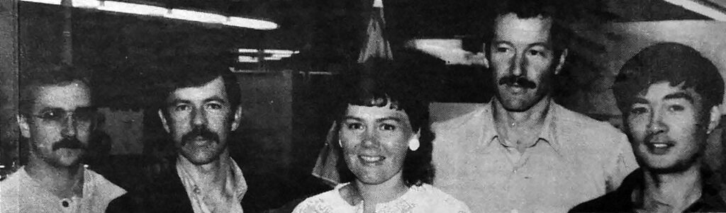 Mark Lawrence, Andre Hebert, Jean Futa, Jock Weir, Art Futa – Management and staff at Taks, Golden, BC